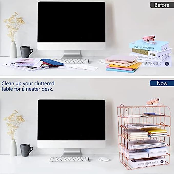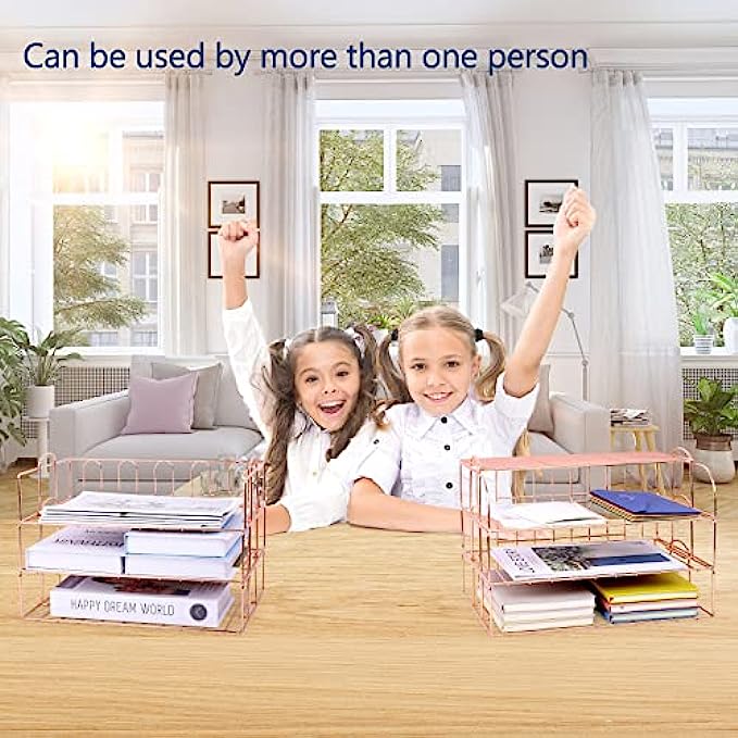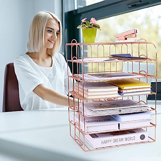 【6 Stackable Trays】-This rose gold desk organizer includes 6 file trays and one upper display shelf. Use this desk file organizer as individual trays or stack them to save more space. You can use them for one person or separate them for multiple people.