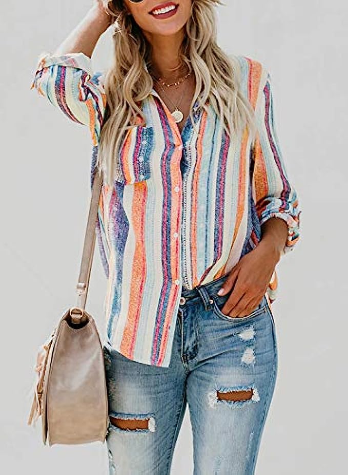 95% Polyester, 5% Spandex Imported Button closure Buttoned front to adjust v neck and comfortable to wear Features: Button down, V neck, Stripes, Color Block,Cuffed Sleeve Match well with jeans, pants, leggings and shorts Suit for daily wear, date, vacation, work, casual,office work If you have any question please feel free to contact us, we will give you the response within 24 hours. Thanks for your support