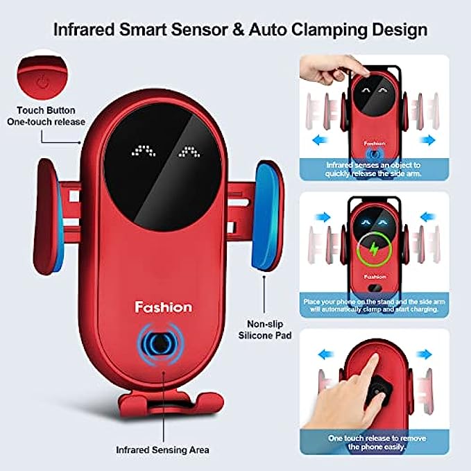 ?Infrared Auto Sensing: Put your phone close to the infrared auto-sensing area of the bracket, it will automatically open to its widest and pause for 2 s(put your phone in time), then automatically retract. When touch the button on the back of the mount, it will release and you can remove the phone. ?10W Fast Charging: The wireless charger adopts upgraded independent pure copper coil, high charging efficiency. Note: For fast charging mode requires a QC 3.0 car charger adapter (not included in the package) of 10W or more as its power supply. ?Upgraded Air Vent Clip: Retractable and 360° rotatable metal hooks, non-slip silicone cushion, high-quality knobs and user-friendly USB trunking design. Easy to install,applicable to more types of Air Vent. ?Cute Design: It designed like a happy healed fashion buddy with shinning eyes. Smiling all the time. The lovely wireless charger makes the boring driving journey more fun! ?Thoughtful Note: Low output voltage from the car's own USB port can cause the wireless charger to open &close constantly or not work. The typp-c port is not plugged in tightly, phone case is too thick or with magnetic/metal/foreign objects, it will cause the device to be unresponsive, slow to charge or hot. ?Safety Security: Wireless charger has overcharging protection, overheating protection, short circuit protection and electromagnetic protection.If the device is abnormal, it will automatically stop working, minimize driving hazards on the road. ?After-Sales Guarantee: We guarantee to provide you with the best quality and excellent service. If the product has any quality problem within 3 months, promise free replacement or refund. Please feel free to contact us for any questions.