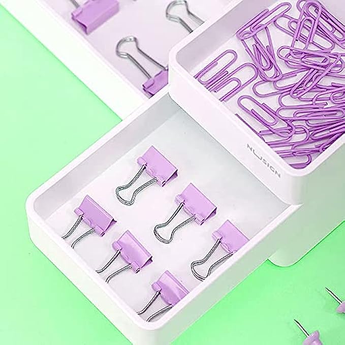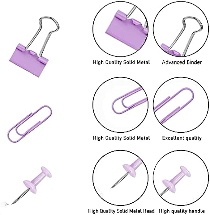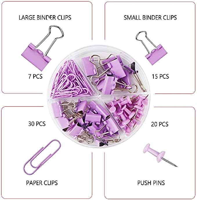 Creechwa Purple Binder Clips and Paper Clips Push Pins Tacks Sets, Total 72 PCS Assorted Sizes Office Supplies Set for Women, Student, School, Home & Desk Supplies