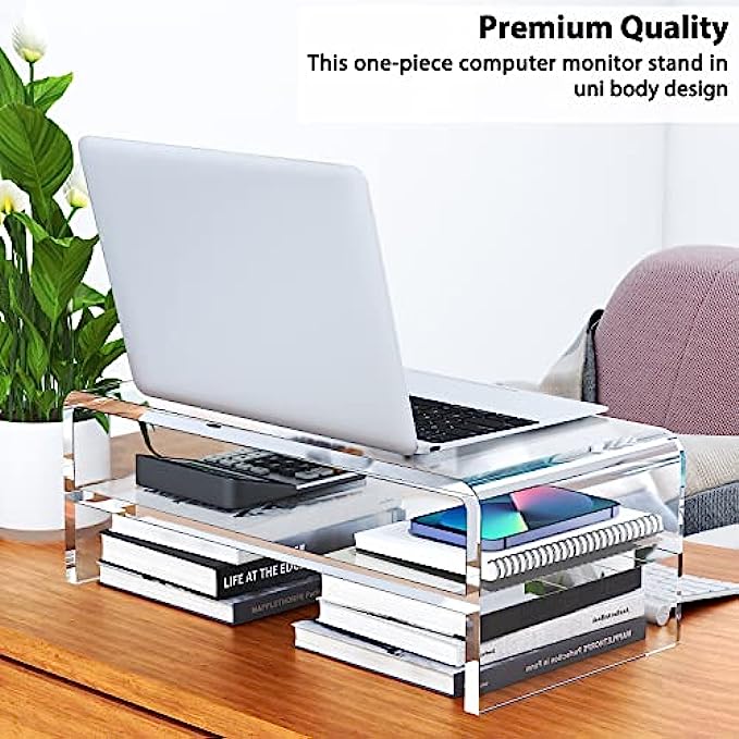 【MULTIFUNCTIONAL ACRYLIC STAND】The clear acrylic stand can not only place a computer monitor or laptop on the desktop, its strength and aesthetics can also be used for a variety of storage, such as organizing set-top boxes and remote controls under the TV; organizing files in the office ; organize books in the dormitory.