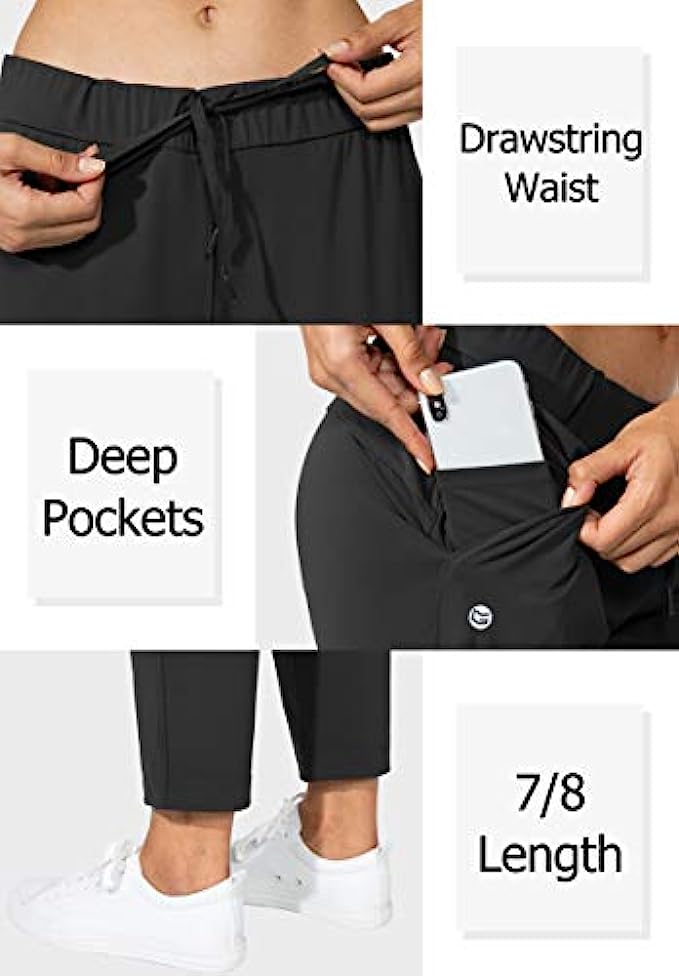 The fabric made of 75% nylon and 25% spandex. Soft and four-way stretch material delivery comfy, solide wear experience. Deep side pockets benefit for working or athletic to hold phone, cards and keys easily. Elastic waistband and adjustable strawcode offer comstom fit. The 7/8 length keep you look very spirit and in stylish during your work or exercise. The pants suitable for work, lounge at home, yoga, athletic, workout, casual wear, run errands.