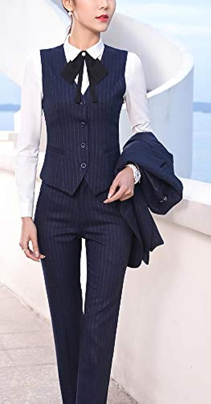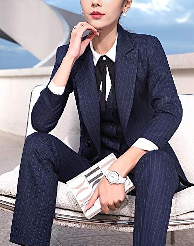 Polyester,Spandex Button closure 【Fabric】- Made of high quality 98%polyester & 2%spandex fabric.The lining is 100% polyester. 【Top】-Fashion notched lapel,and thick shoulder pads.Exquisite and stick double closure fasten the suit.Practical front pockets with covered placket.Simple long sleeve cuffs design,unique strip pattern design,waisted,regular and neat blazer hem,single-breasted button vest. 【Buttom】-Straight fit pants,stretch skinny trousers,exquisite pants loop,perfect rise with elastic waist,funcitoning slant pockets design.Rise your waistline,select the full color fabric handle delicate easycare. 【Suitable】-For office, work, holiday, dating, home, etc.Suitable for all occasions.You can pair it with white shirt.Different match gives you the different style. 【Washing Instruction】-Soak in cold water for 15 min, then washing with normal detergent . The temperature of the lotion should not exceed 45 °C. After washing, ventilate and dry, do not expose to the sun.