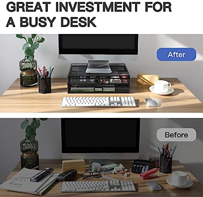 Monitor Stand, Monitor Stand with Drawer, Monitor Riser Mesh Metal, Desk Organizer, Monitor Stand with Storage, Desktop Computer Stand for PC, Laptop, Printer - HUANUO