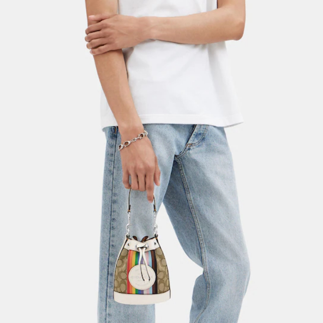 PRE-ORDER COACH Mini Dempsey Bucket Bag In Signature Jacquard With Rainbow Stripe And Coach Patch CJ661
