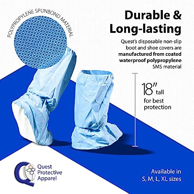 Quest’s disposable non slip boot and shoe covers are manufactured from coated waterproof polypropylene SMS material, providing you with indoor protection from light splashes throughout the day
