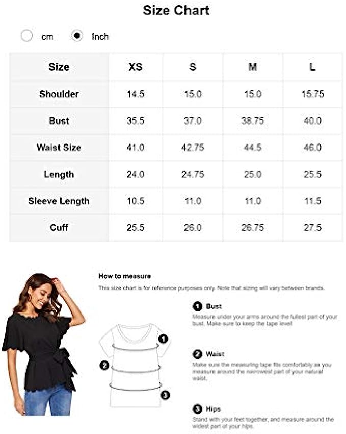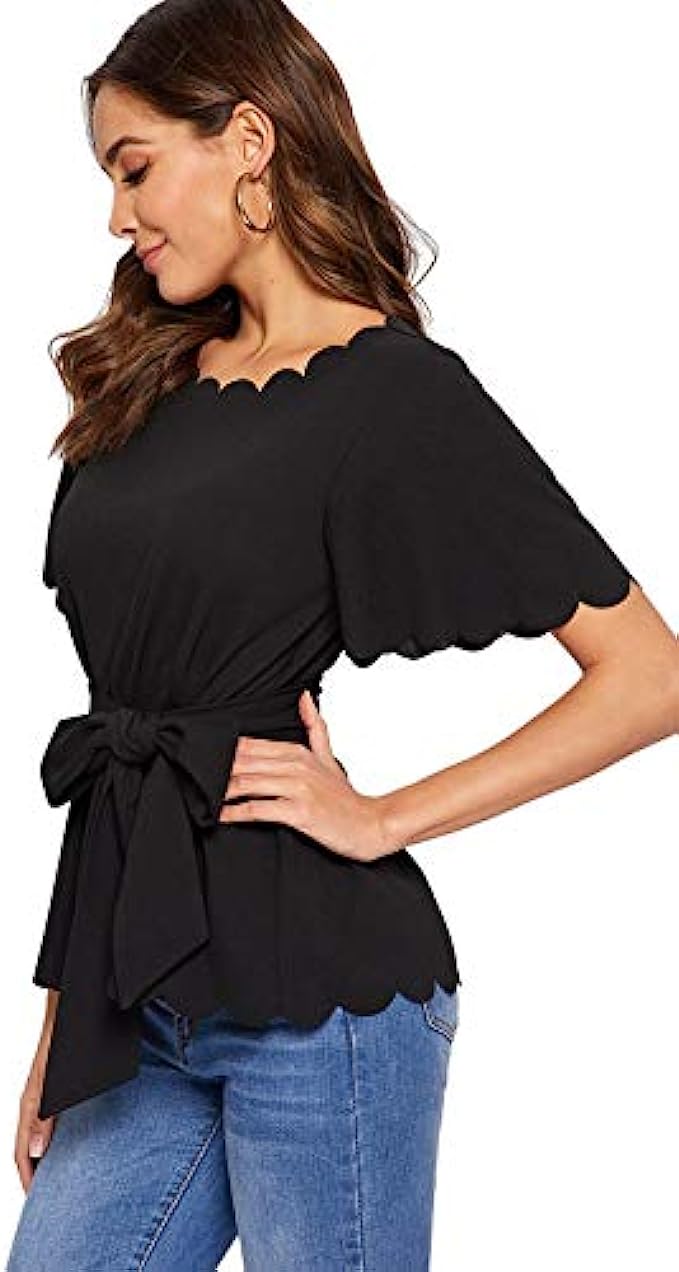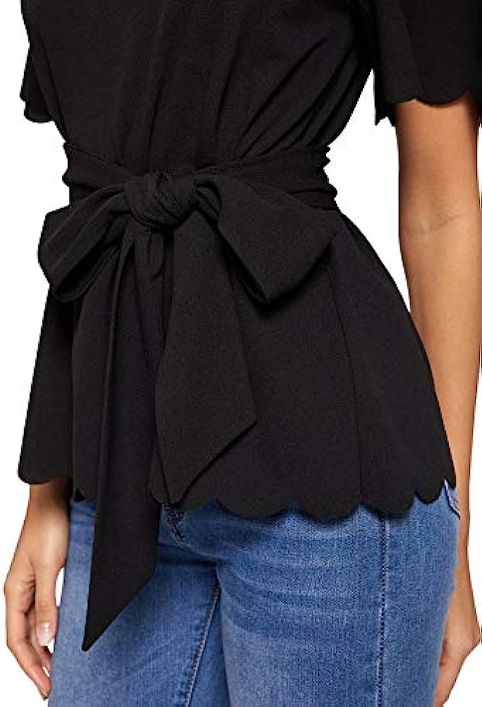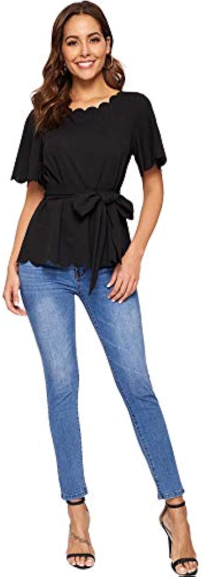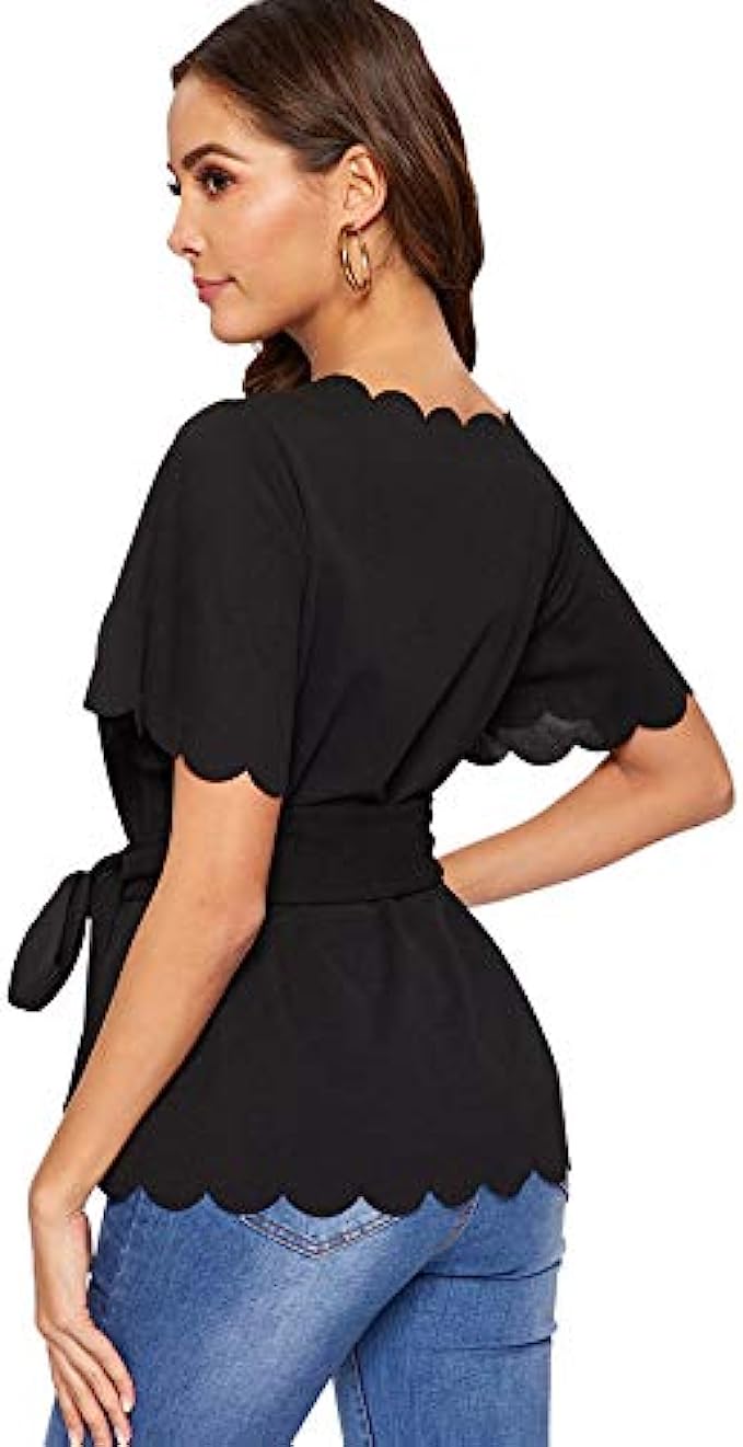 Soft Fabric Imported Drawstring closure Machine Wash Material: 95% Polyester& 5% Spandex; soft and breathable, stretch fabric Elegant Design: Scalloped neckline and hem, scalloped cuff, short sleeve, classic color, adjustable belt which you can tie to bowknot, show your slim waist Gorgeous short sleeve blouse for office work ladies, women and juniors. Pair this women fashion top with your skirt, jeans, pants or leggings