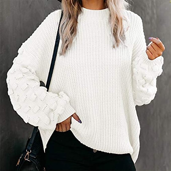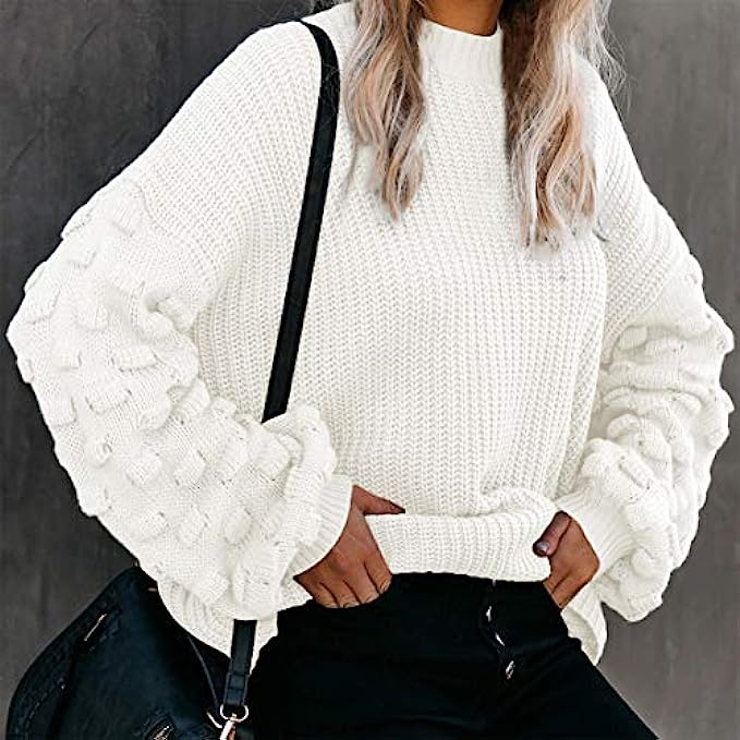 Sovoyontee Women's Cute Oversized Crewneck Loose Puff Sleeves Chunky Knit Pullover Sweater