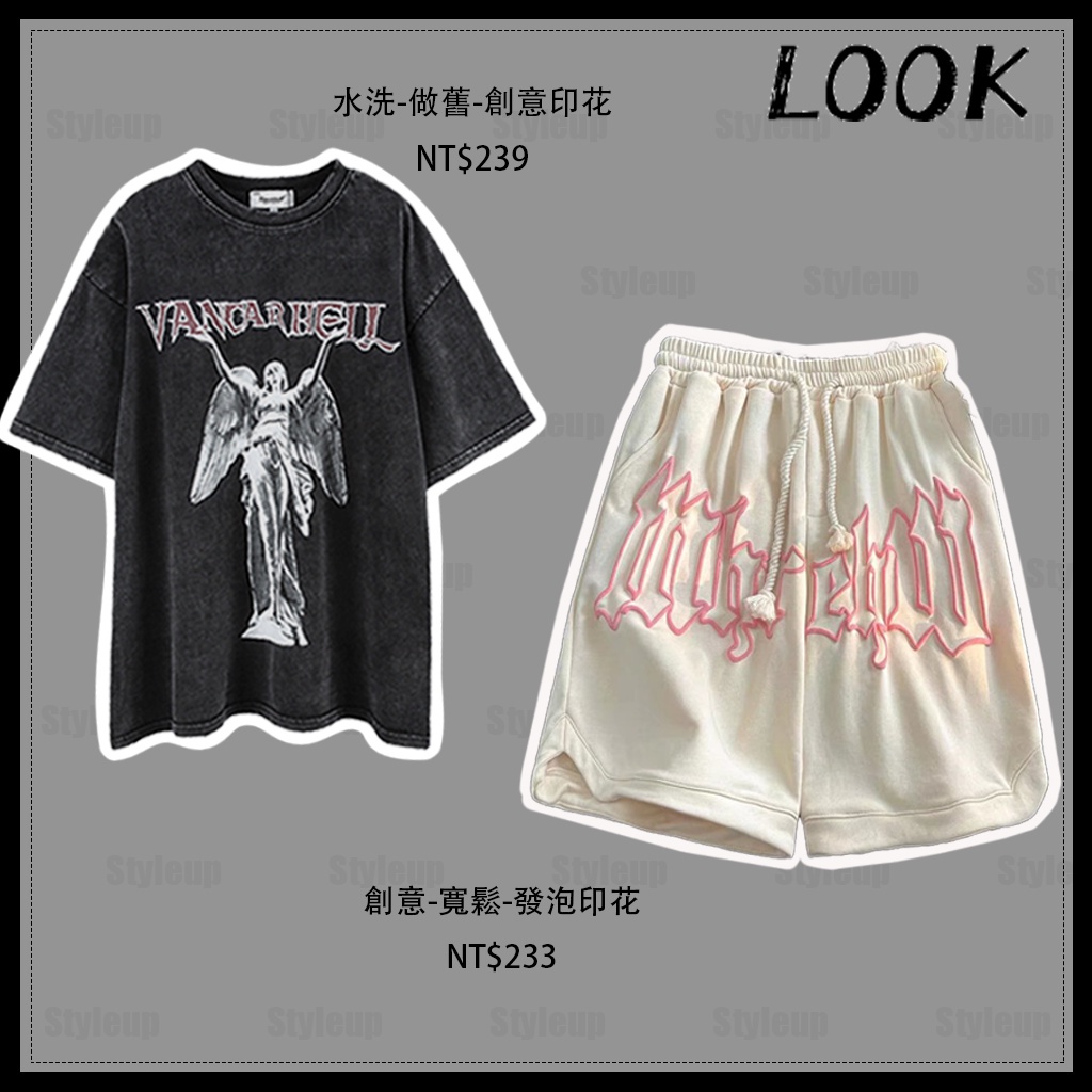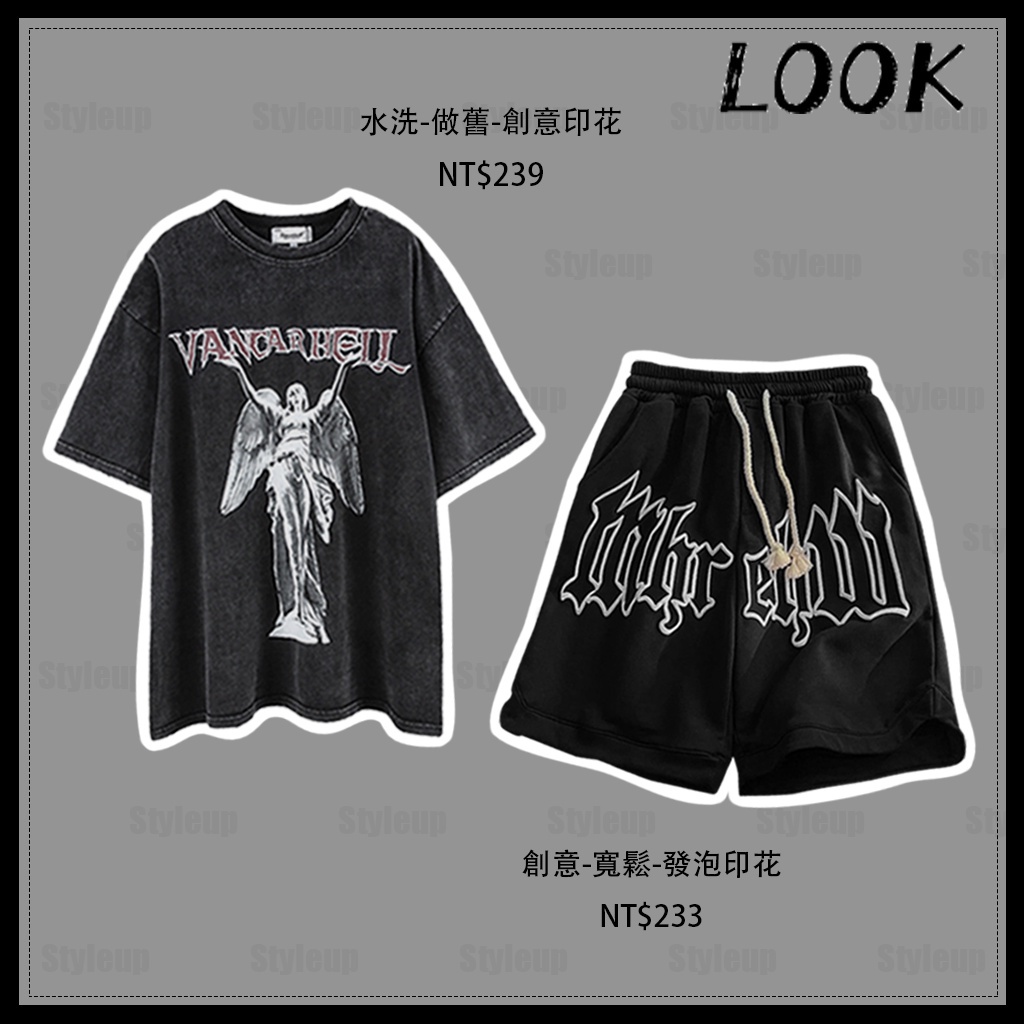 Style&Up 夏季新款 水洗做舊T恤 休閒寬鬆 運動短褲 套裝男 美式復古 短袖上衣 休閒短褲