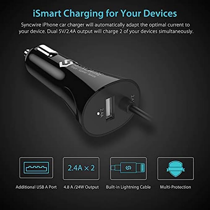 I-smart design - the combination of lightning cable and additional USB port allows Syncwire Lightning car charger Charge any two devices simultaneously with max up to 4.8a output, and it automatically adapts the output to each one accordingly.