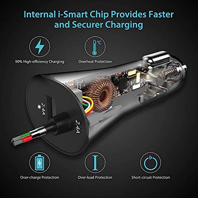 Lightning-fast i-Smart USB car charger - compatible with Apple iPhone 13/12/11/XS/XS Max/XR/X/8/8 Plus 7/7 Plus/6S/6S Plus/6/6 Plus/SE/5S/5C/5/iPad/iPod. Additional USB port can charger any other USB-powered devices including Samsung Galaxy, Note, Nexus, HTC, Sony, LG, tablet, power bank and more.