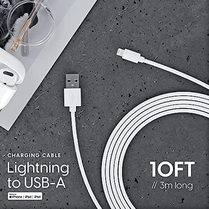 iPhone lightning charger cable is a 10' long cord that provides a max-speed fast charge from USB wall charger adapter or portable charger to your iPhone, iPad Air, Pro, or iPad Mini
