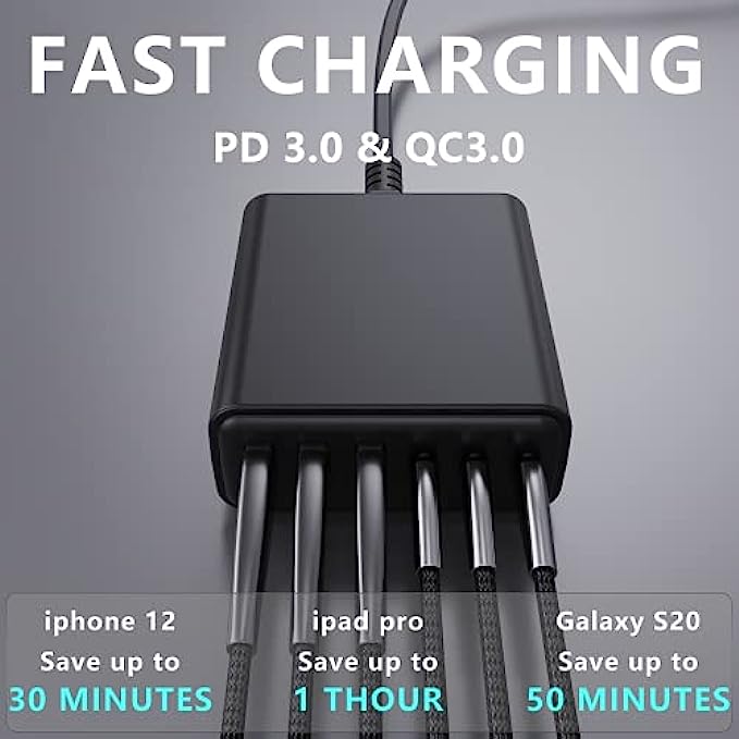 【SIX-in-One】: With 3USB-C Power 60Watt Delivery port, each port 20W and 3 USB port, you’re ready to charge six of your devices simultaneously. Extended power cord for convenience and portability Handy for home office and on-the-go charging.