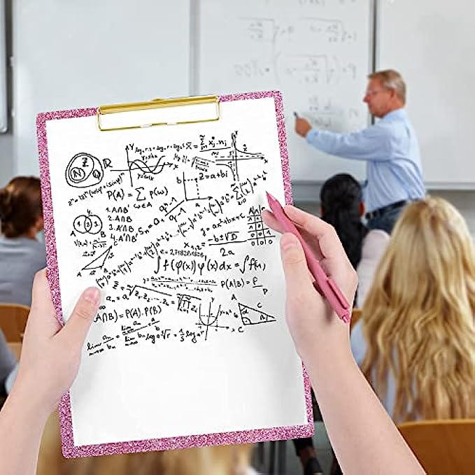 Package :1X glitter acrylic pink hardboard,12.2 INCH x 8.7 INCH; It can hold letter size paper sheets (standard 8.5" x 11"), letter sized clipboard, golden low profile metal clip, retractable key hole.