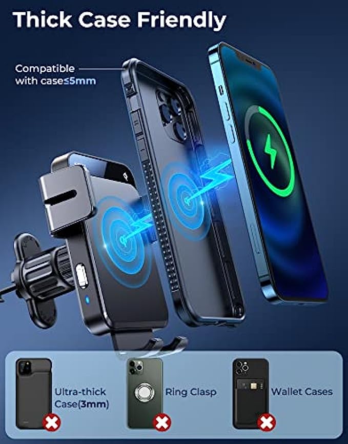 ? 【Qi Wireless Car Fast Charger】 Qi certificated, the 15W wireless car charger mount is for LG V50/V40/V30+/V30/V40, ThinQ G8/G8S/G7; 10W for Samsung Galaxy S20+/S20/Note 10+/Note 10/S10+/S10; 7.5W for iPhone 13 pro max/13 pro/13/12 Pro/12/11/11 Pro/11 Pro Max /SE /XS /X/XR/8 Plus/8. And other Qi-enabled cell phones with up to 5W standard charging. Note: iPhone 12 Mini is not supported. ? 【Auto-Sensing & Smart Charging】 After connecting to the cable, Joyroom car phone holder mount wireless charging will automatically clamp when your phone is dropped in. A gentle touch on the 2 sides button of the car charger can make the arms open, which makes your driving easier and safer. When your phone is fully charged, the wireless charging car mount will automatically power off to protect the battery of your phone. ? 【Super Stable Base】Joyroom phone mount for car wireless charger's base is equipped with a powerful suction cup and professional 3M adhesive (high temperature resistant). The base's suction cup has been tested thousands of times, it can absorb more than 20 pounds of objects without dropping. Even if passing speed bumps or driving on mountain roads, you don’t need to worry about it falling. In addition, the bracket arm and clip are equipped with silicone pads for anti-slip and anti-vibration. ? 【Flexible Angle & Case Friendly】 With a retractable & foldable bracket and 360° rotatable head, it never blocks your driving sight, you can adjust it to a position that makes you comfortable. Joyroom car mounts wireless charger supports charging through phone cases up to 5mm thick. Please note that cases made of metal, external attachments such as magnets, credit cards, grips, and stands will interfere with charging. ? 【2 In 1 Design】Combines the wireless phone charger & car phone mount allowing for a secure hands-free experience. Keep you away from the tangled locating cords or cables. Joyroom car phone holder mounts charger is suitable for Windshield, Dashboard, and Air Vent installation, and makes GPS and phone calls more convenient.