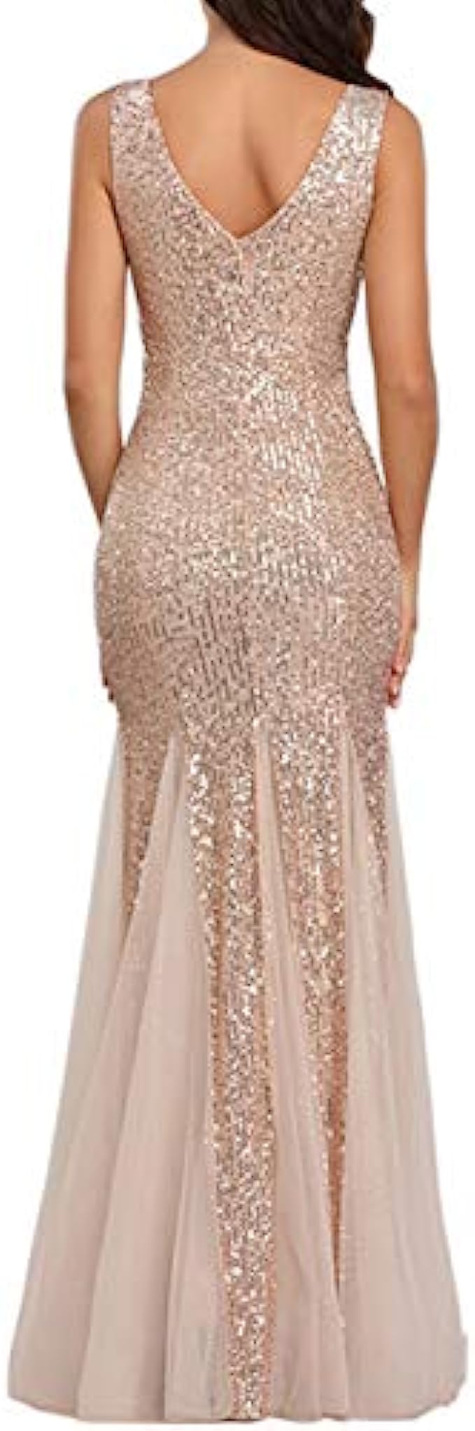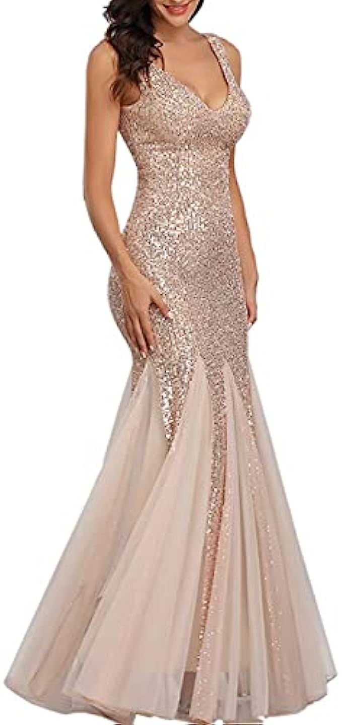 • Glitter Tulle Mermaid Dress for Womens:Sequin outside, sparkling and unique, cocktail maxi dress is fitted and sexy, empire waist design, gauze ruffle bottom is also unique and elegant, patchwork with tutu and sparkle. Sexy deep v-neck and invisible high quality zipper in back part of formal floor length dress, two cozy pads in breast parts.