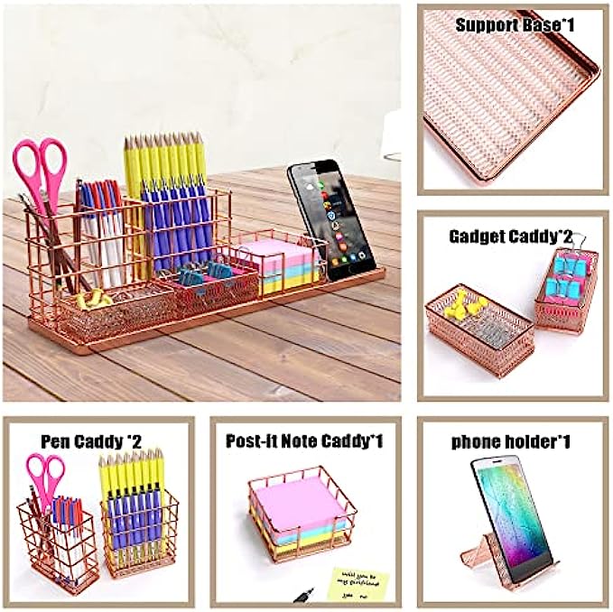 7 in 1 Desk Organizations: pen holder x 2, binder clips trays x 2, phone stand x1, post-it notes holder x 1and support base x 1.