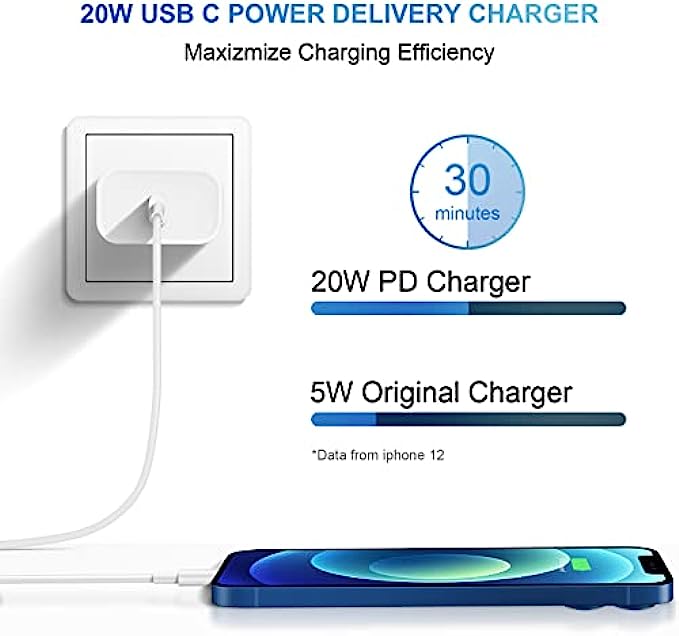 【Unrivaled Speed】- iPhone Fast Charger equipped with 20W PD 3.0 USB Type C power delivery wall plug, PD 3.0 Quick-Charge USB C port provides Max 20W output power, charge your device up to 3x faster than original 5W charger,charging your iPhone 13 up to 50% in just 30 minutes, saving over 1.5hrs for you.