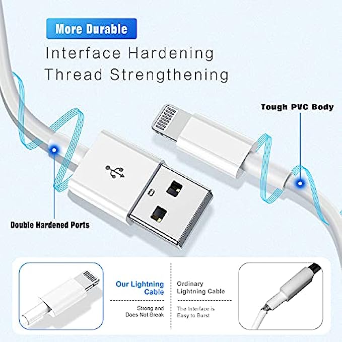• 100% Perfect Compatibility:Our iPhone USB lightning cables works seamlessly with any new iPhone iPad, including iPhone 12 iphone 11 Pro Max SE X XS XR 8 8Plus 7 7Plus 6S Plus 6 5S 5C 5, iPad air mini pro, iPod, Airpods and more. Compact lightning connector head design ensure that the iPhone charger cable fit most phone cases and accessories.