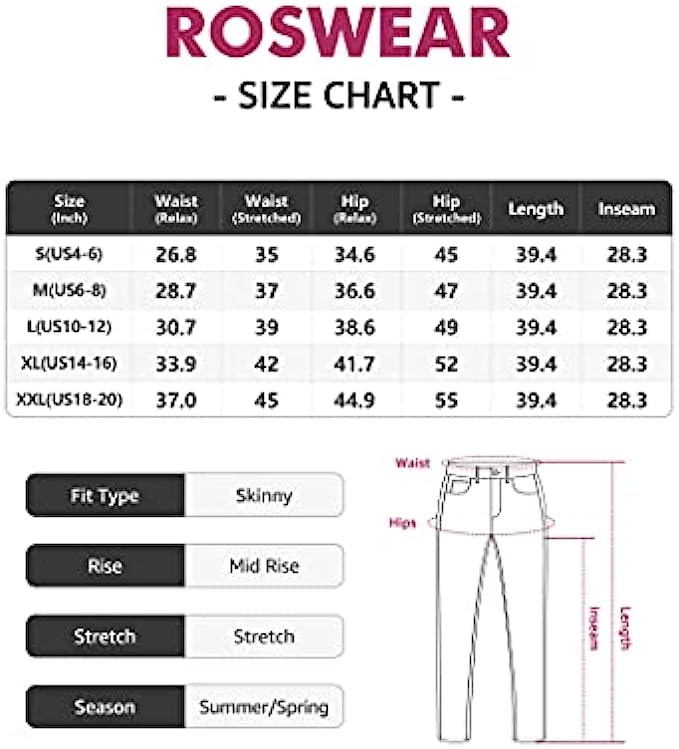 97% Cotton, 3% Spandex Imported Zipper closure Machine Wash Roswear ripped stretchy skinny ankle jeans with belt loops and five pockets, high-rise waist, distressed details. Close to the body are designed to perfectly show your beautiful leg silhouette and the shapes of your curves. Roswear carefully selects super elastic, soft lightweight and breathable fabrics, so that you will feel free in all positions when sitting or squatting.