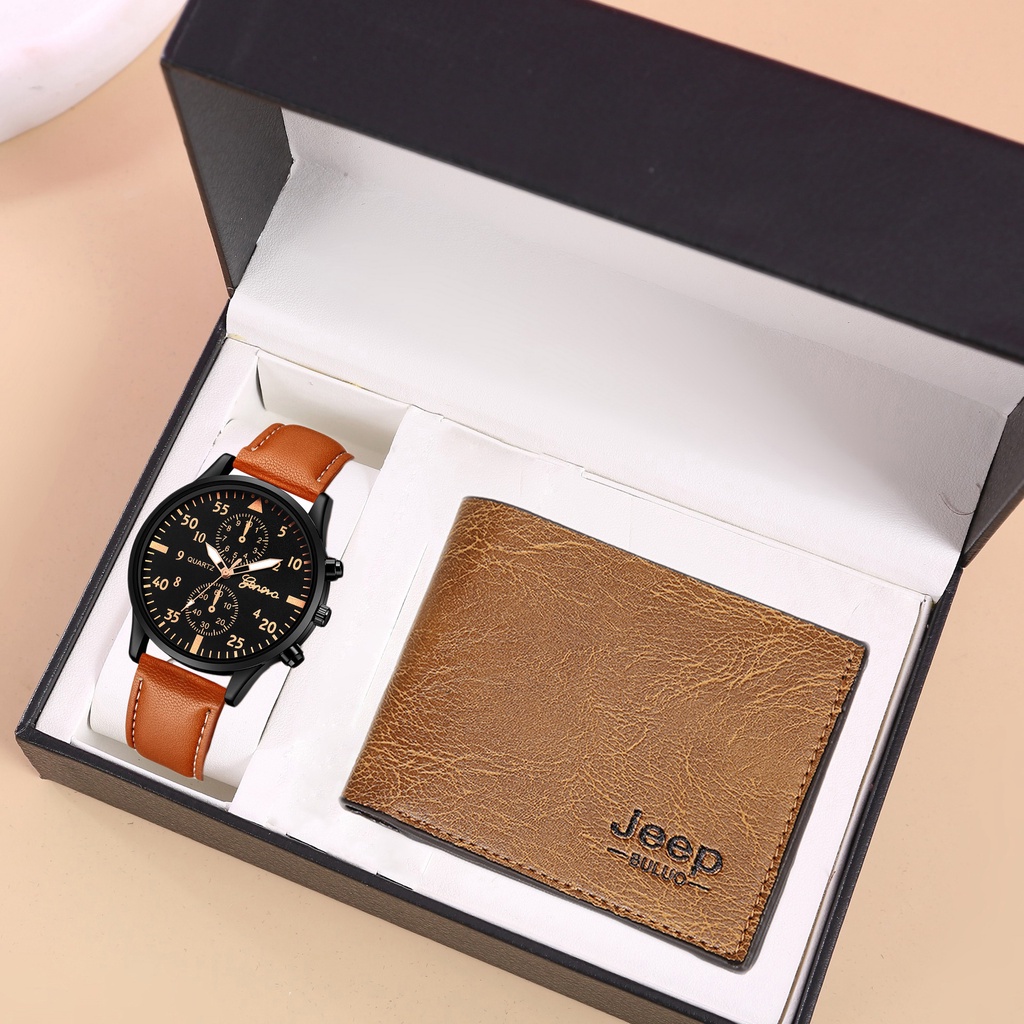 Colour:brown Material Quality:very good My husband likes because he get new watch and wallet