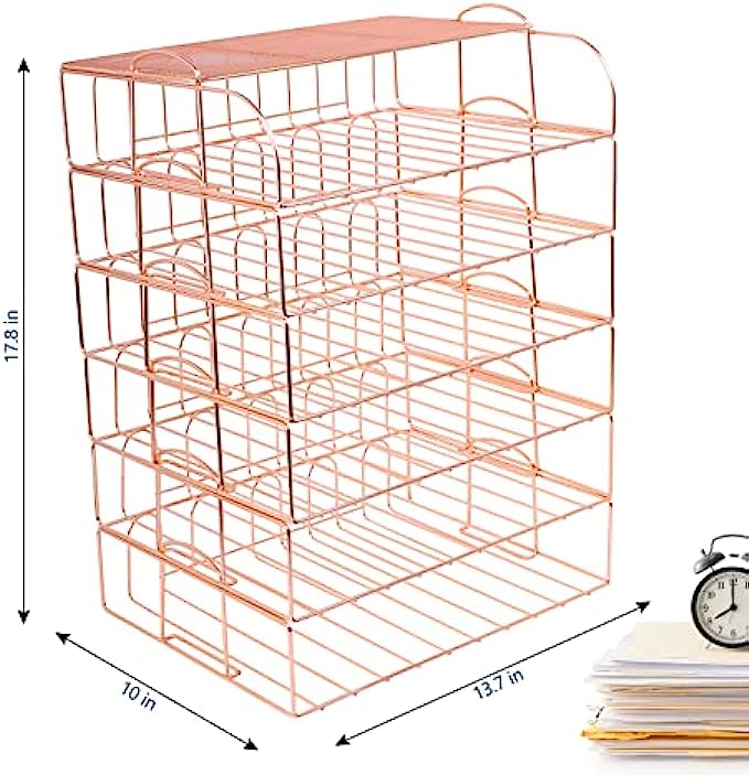 【6 Stackable Trays】-This rose gold desk organizer includes 6 file trays and one upper display shelf. Use this desk file organizer as individual trays or stack them to save more space. You can use them for one person or separate them for multiple people.