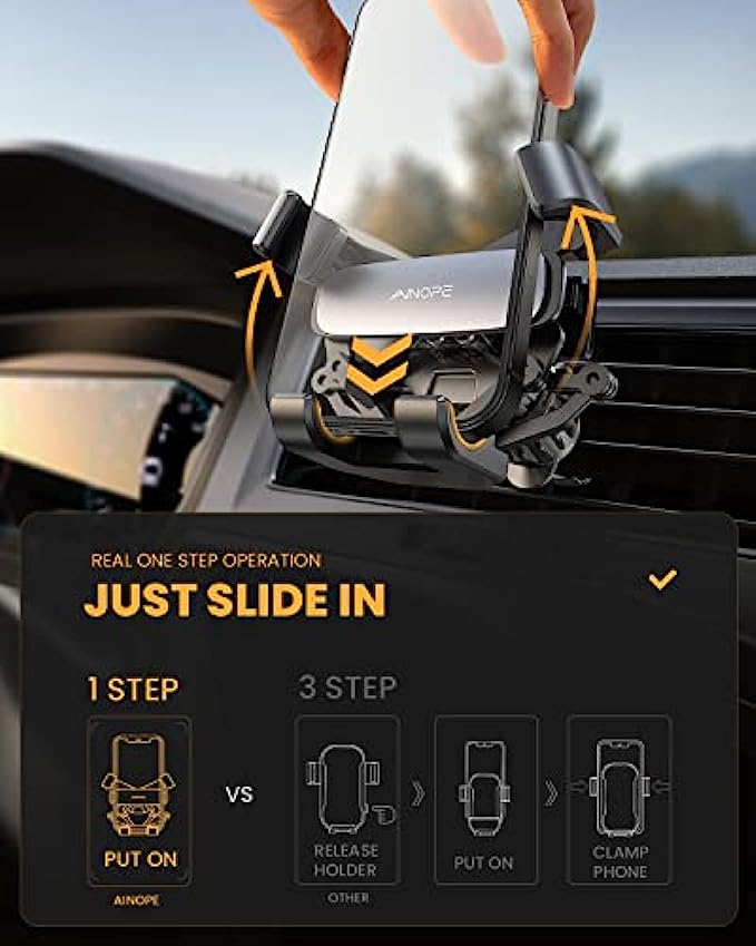 • ? THE EASIEST OPERATION & JUST SLIDE IN AND GO: Just slide in your phone, car phone holder mount clamps the phone automatically by gravity and provide the easiest operation and a strong stable hold without button to press. Easy to drop phone in and pick phone up with two fingers. Compaired to old car holder, you no longer free hands to spend too much time in looking down to place phone while reseting the navigation route. When getting off car in a hurry, just pick up phone and leave in seconds.