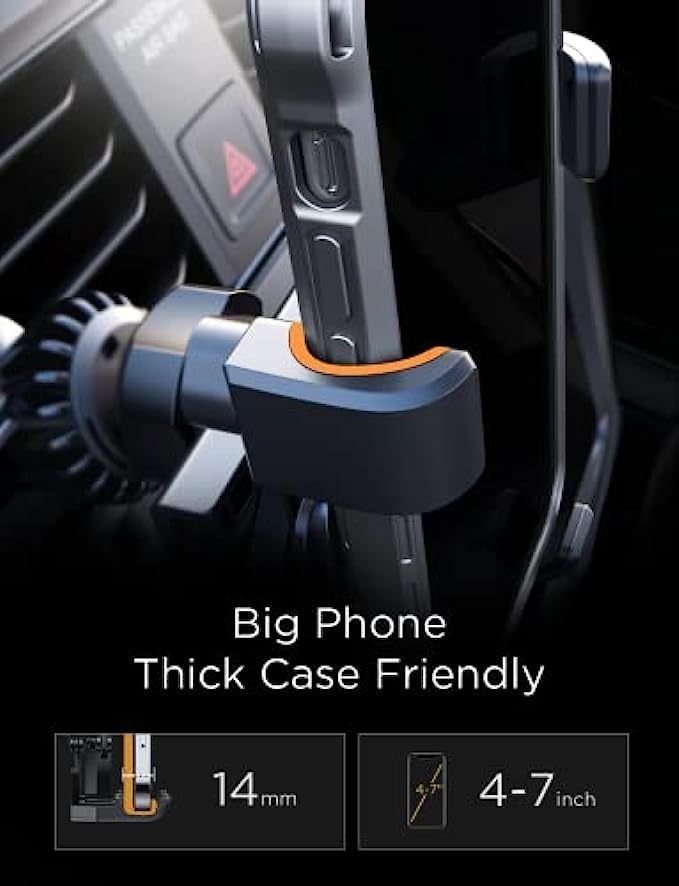 • ? UNIVERSAL COMPATIBILITY: This universal car cell phone holder will firmly hold all the smart phones (4-7in) even with thicker case (≤14mm) compatible with iPhone 13 12 pro max/ 11 pro max/XR/X/8/7/6/5, Note 20 10/ Galaxy S10+/ S9/ S8 /S7 /S6 and more. NOTE:WE RECOMMEND USING THE SMALLER PHONE(<4.7inch) WITH PHONE CASE