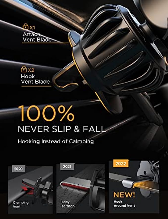 • ? UPGRADED AIR VENT HOOK: This car vent phone holder mount is designed as "Hook shape" and form "Three grasp points" which can firmly hook around the a/c vent for no slippage or movement. It solving the market's common problem of falling forward and off the air vent constantly when going over bumps or turns. NOTE: THE LENGTH OF CLAMP BETWEEN 0.41-0.98IN. THIS PHONE HOLDER ONLY COMPATIBLE WITH HORITABLE AIR VENT.