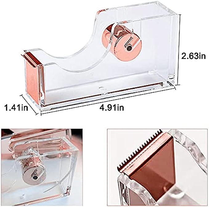 【ADD STYLE AND ELEGANCE TO YOUR DESK 】This tape dispenser featured in high transparent acrylic materials partners beautifully with the metallic rose gold cutting blade. It brings a modern touch to your desk that will stand out from the rest of your equipment and catch the eye of anyone.
