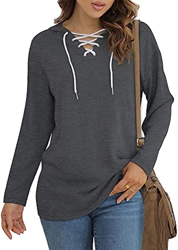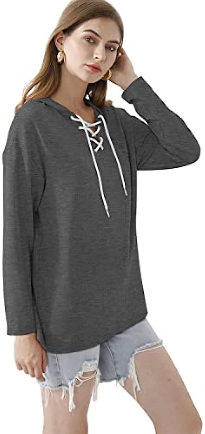 ?【Skin-Friendly Material】: 78%polyester + 17%rayon + 5%Spandex. very soft and comfortable to wear in both fall/ winter/ spring, high quality material to provide you more comfy wearing experience. Lace Up closure Machine Wash ?【Fashion Design】: V neck hoodies is very cute and cozy in life, very feminine fall tshirts for women that features lace up, pullover, hooded, deep v neck solid color drawstring sexy loose fit sweatshirt casual basic hoodies for women, bring a fashion and casual look, which are easier to catch his eyes. ?【Versatile Match】: The womens long sleeve tops perfect to pair with jeans, pants, leggings, shorts, skirts, and even your boots, high heels or sneakers for a cool and stylish lookalso can wear it under coats during cold Winter. the pullover tops for women , is design for any bodyline , will be a good choice for you. ?【Mutiple Occasions】: Fashionable and loose comfy pullover sweatshirt is perfect choice for daily wear, dating, party, light sports, camping, running, holiday, school, festival, shopping, dinner, party, night club, vacation, louging around, home, street or work, etc. and any other occasions in spring, fall or winter, this blouses will become a staple in wardrobe can be worn for so many different occasions. ?【Garment Care】: Easy to clean, machine or hand wash are available, hang dry, low iron when necessary, do not bleach. ?【Size Information】: MODEL IN MAIN IMAGE: 5'8", 123lbs, wearing womens solid color basic sweatshirts Small. Before order, please attention the size chart in the picture is the actual Length of tops, select the size according to it. Amazon size chart is not ours, DO NOT USE IT !!!