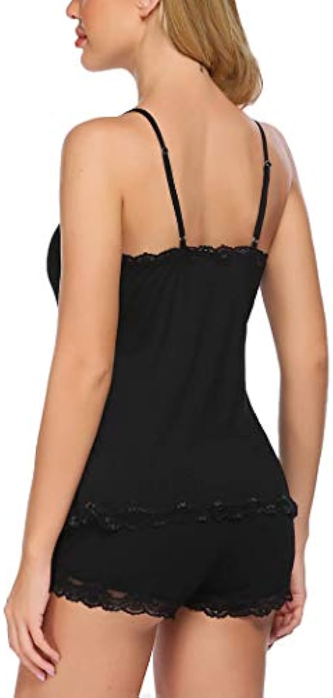 95% Polyester, 5% Spandex Imported Pull On closure Hand Wash Only Eco-friendly fabric: 95% Polyester, 5% Spandex. This women short pajama set is made up of slim-fit cami and easy-fit pants. It is soft and comfortable for your lounge time. 2 piece PJs set with a good elastic camisole & sexy shorts. Sleep top: sexy sheer and lace neckline with a bow and adjustable spaghetti straps.Sleep bottom: special shorts hem with sheer and lace design, elastic waistband with bow decoration in the middle of the front. Its casual style makes it not awkward even when guests visit. Take it as: pajamas sent for women, camisole and shorts, women's pajama shorts set, shorts pj sets for women, soft sexy pajamas for women, short sleepwear set for women, cami and shorts sleepwear sets, women's pajama sets sexy, pj sets for women shorts, cami sleep set. Simply relax in a lightweight pajama and have a good night.