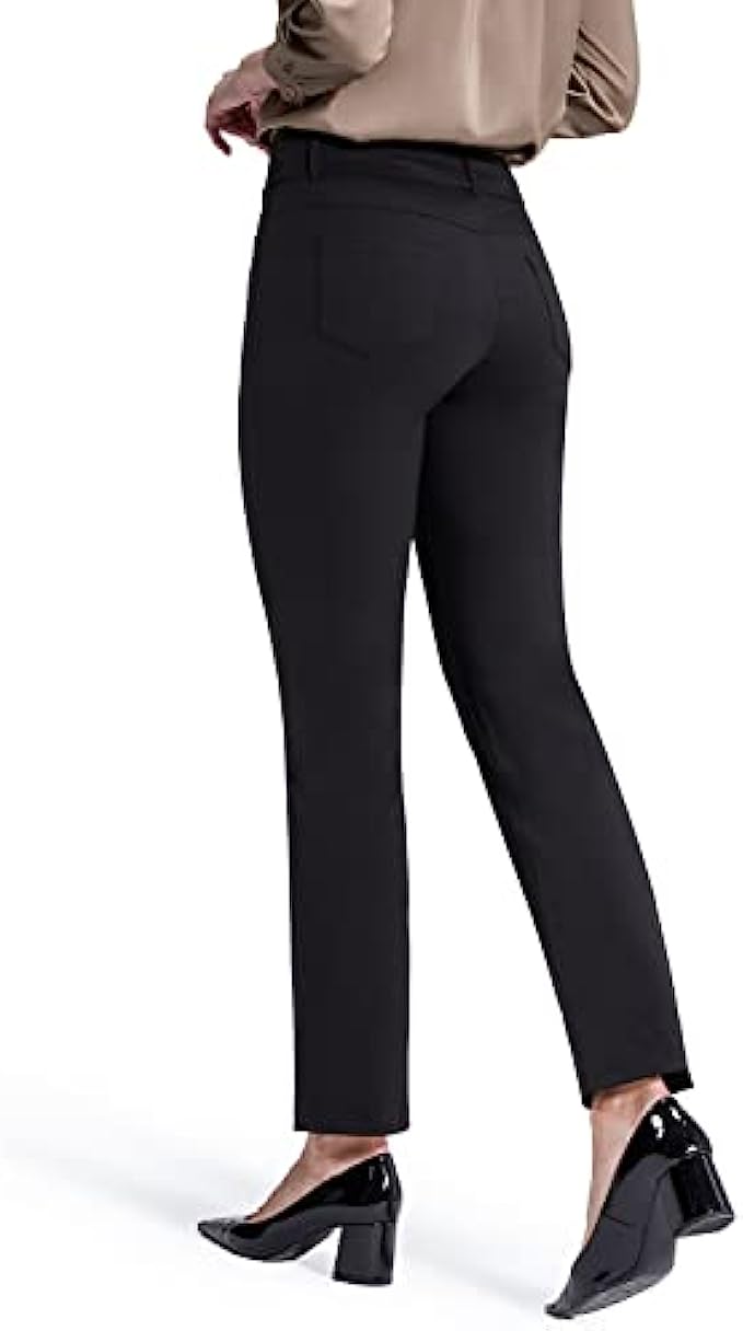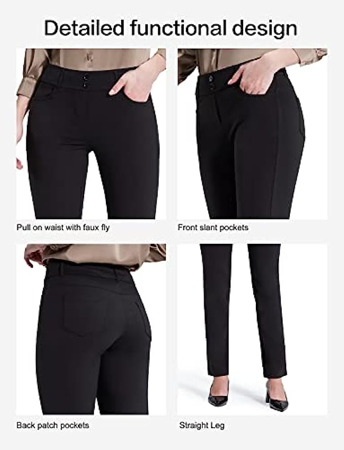 87% Polyester, 13% Spandex Imported Pull On closure Pull-on womens pants, no zippers, tummmy control for support. Easy to put on and won't fall off when you bend or squat. Unique style: stretchy waistband, false front, light-tight, wrinkle-resistant. Two decorative buttons at waist make the pants more fashionable. Straight leg design to show your streamlined appearance. The relaxed fit pants are superior comfortable and flatter many body types and shapes. Functional pockets:2 front pockets and 2 patch pockets at the back, are designed to provide enough storage to put some essentials when you go out or work. Solid black dress pants for womens can be well matched with many styles of suits to meet your needs. Appropriate for most occasions.