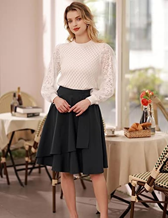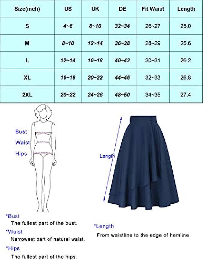 95% Polyester, 5% Spandex Imported Hand Wash Only Feature: Double-layer ruffle hem, Flowy A-line midi skirt for women, Knee-length, High-waisted wrap skirt, Pockets,Decorative buttons at the waist, is great for both dressy or casual look, can be dressed up with heels or down with flats High Waisted Long Skirt: you will love our wrap midi skirt when you wear it, everyone wants a fashionable casual skirt for women, it is comfy and makes you look elegant and fashion Occasion: Simple retro solid-colored design, that will never be out of date. The high waisted skirt is suitable for dates, work, office, school, travel, party, cocktail, beach, vacations, Halloween, and daily casual. Perfect for spring, summer, and autumn, easy to match all kinds of tops Size Guide: Small=US 4-6, Medium=US 8-10, Large=US 12-14, X-Large=US 16-18, XX-Large=US 20-22;Please choose your size according to our size chart image Garment Care: Machine washable, recommended with a laundry bag, do not bleach,Iron before wearing