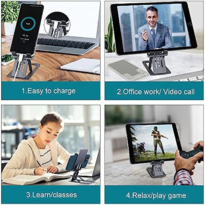 ?【Anti-slip Fixing】The back and grooves of the mobile phone stand are designed with non-slip silicone pads, and there are four non-slip rubber pads at the bottom of the stand, which can ensure that your phone or tablet is fixed on the desktop, preventing sliding and allowing you to tap the screen easily, No need to worry about your phone tipping or dropping.