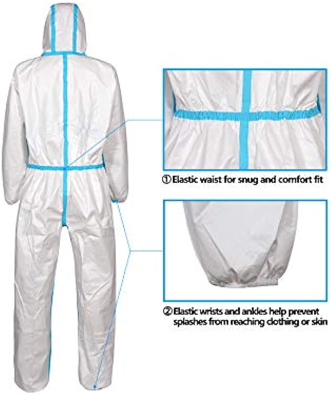 Zipper front with protective storm flap, attached hood, elastic wrists and ankles help prevent splashes from reaching clothing or skin. Hood with elastic around face opening, designed to cover neck and chin and fit around face mask.
