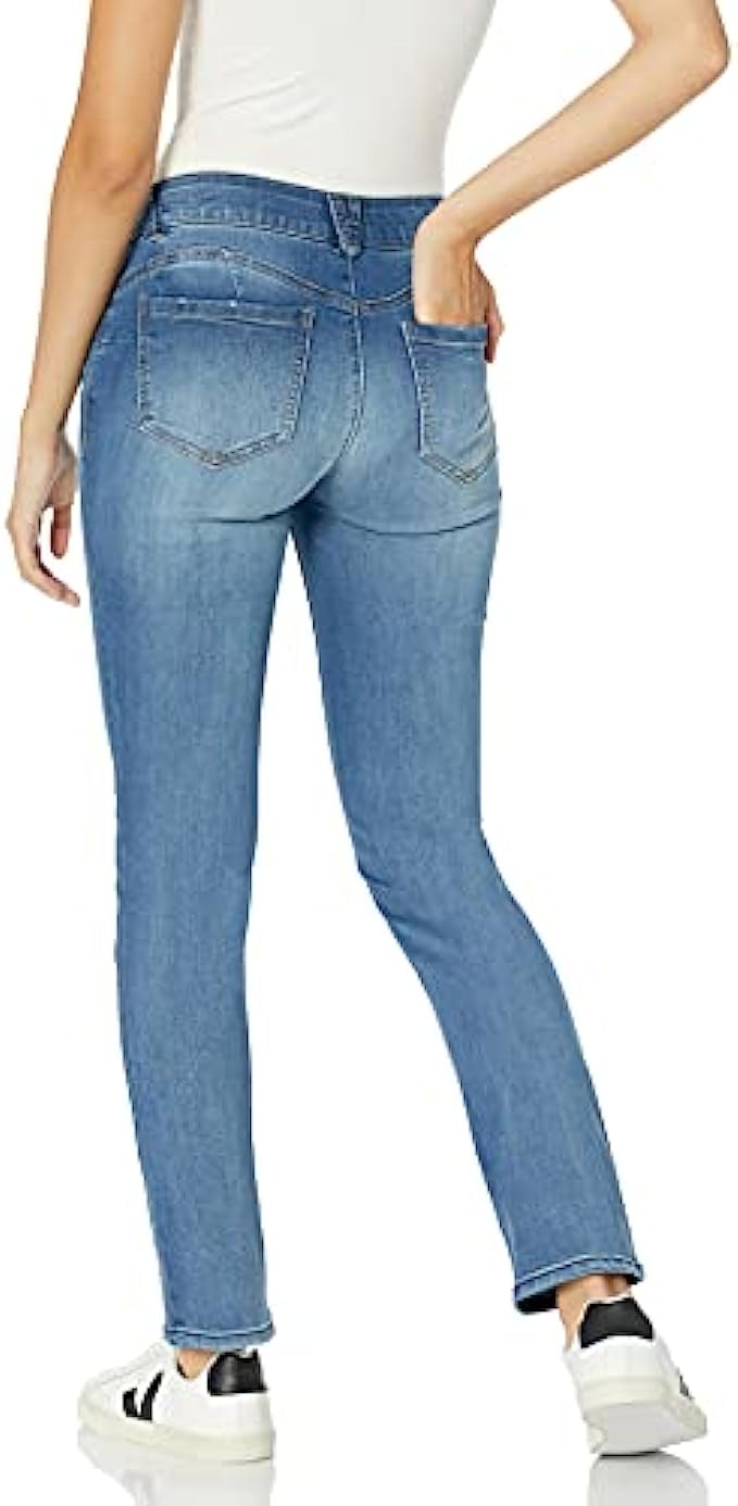 54% Cotton, 27% Rayon, 17% Polyester, 2% Spandex Imported Zipper closure Machine Wash Democracy’s signature “Ab”solution jean uses innovative construction that incorporates super-stretch denim, slimming panels, a hidden inner elastic waistband, mesh panels, signature curved back yoke, and strategically placed pockets Democracy classic Straight Leg jean made with soft, premium fabrics Also available in short and long inseams and Petite and Plus sizes