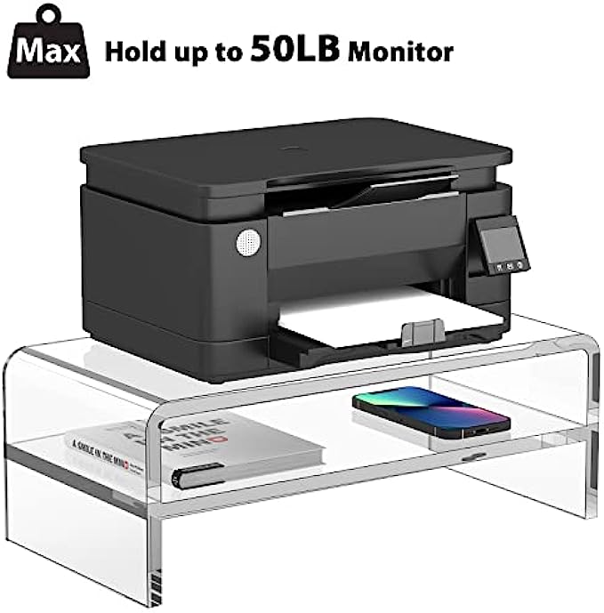 【RUGGED AND DURABLE】The thickness of the acrylic computer monitor stand panel is 0.4 inches, and the acrylic has enough rigidity to withstand up to 50 pounds. Acrylic computer stand can be used to place common electronic products such as computer monitors, laptops, printers, etc.
