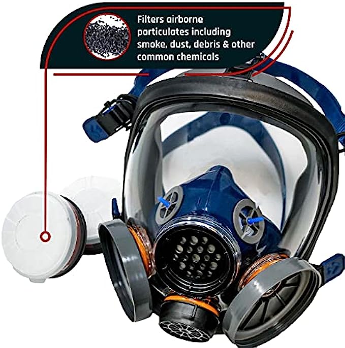PROFESSIONAL HEAVY DUTY FILTRATION SYSTEM – Dual Activated Charcoal filters & full face impact resistant lens.