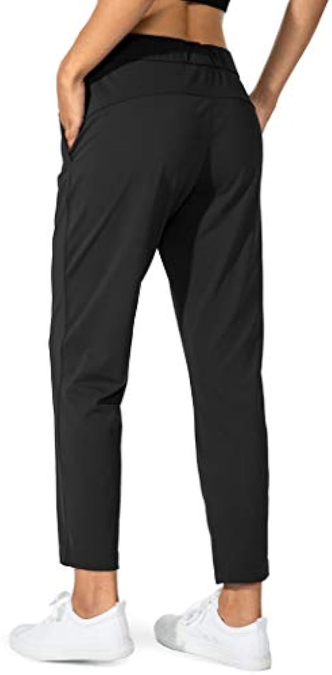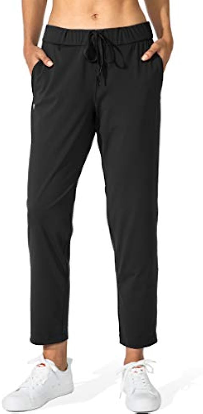 The fabric made of 75% nylon and 25% spandex. Soft and four-way stretch material delivery comfy, solide wear experience. Deep side pockets benefit for working or athletic to hold phone, cards and keys easily. Elastic waistband and adjustable strawcode offer comstom fit. The 7/8 length keep you look very spirit and in stylish during your work or exercise. The pants suitable for work, lounge at home, yoga, athletic, workout, casual wear, run errands.