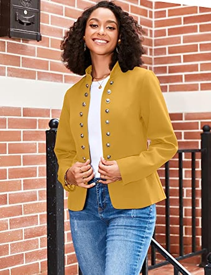 • Women casual open front blazer features long sleeves and stand neck. Fully lined, unstretchable, shoulder padded.