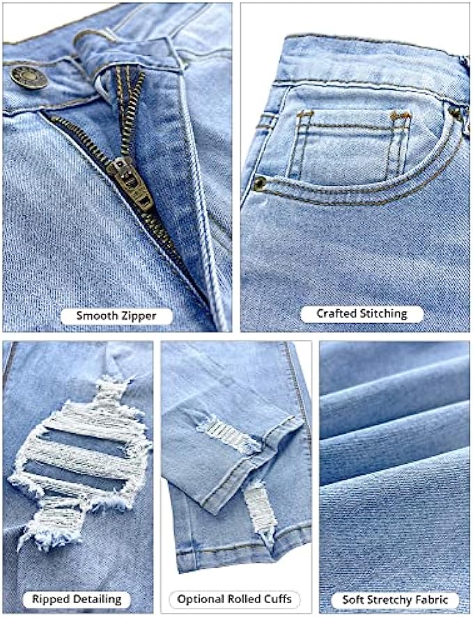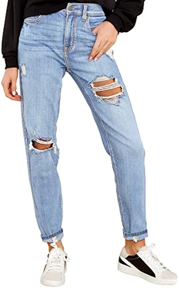 72% Cotton, 27% Polyester, 1% Spandex Imported Zipper closure Machine Wash These high rise distressed jeans for women are featured in relaxed fit, tapered leg and ankle length with optional rolled cuffs. Stretchy mom jeans are sure to flatter your curves perfectly. Casual relaxed fitting mom jeans with ripped detailing, 5 traditional pockets, zip fly and button closure. Ripped denim jean pants for women with soft, breathable, durable and stretchy denim fabric for everyday comfort. Keep your look trendy and laid back by wearing these fashion ankle jeans with a comfy tee and sneakers, boots or heels. The tapered leg design will elongate your legs and balance your figure well.
