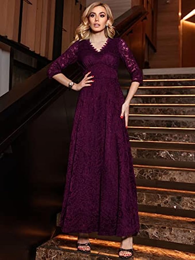 90% Nylon, 10% Elastane Imported Zipper closure Size RECOMMEND:US 4/6(Small), US 8/10(Medium), US 12/14(Large), US 16/18(X-Large), US 20 (XX-Large). This Elegant Dress is Perfectly Fit For All The Occasions: Formal Evening Prom, Wedding Party, Cocktail Club. Full Lace Overlay, Floral V-Neck, See-Through Sleeves. Vintage and Chic Style, Zipper on the Back, Retro High Waist Design, Floor Length. Care Instructions: Please Put The Dress Into A Laundry Bag For Wash It With Low Temperature and Iron Carefully in Low Temperature Too.