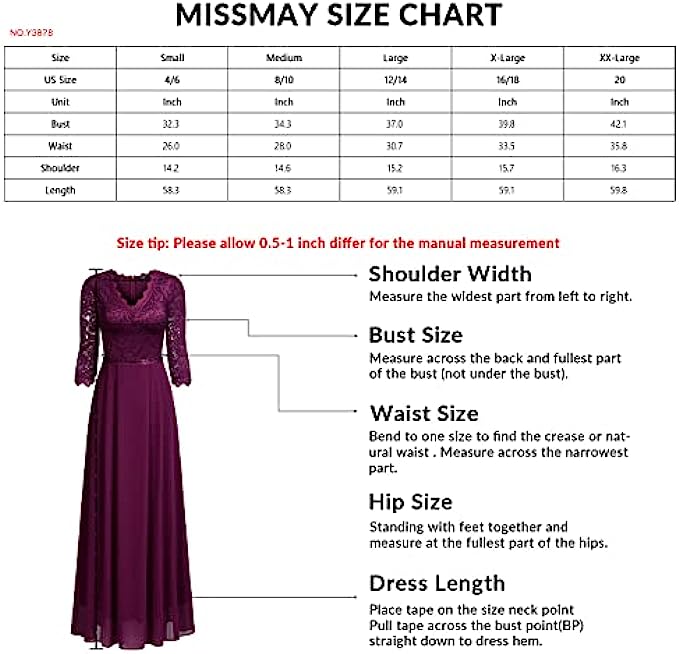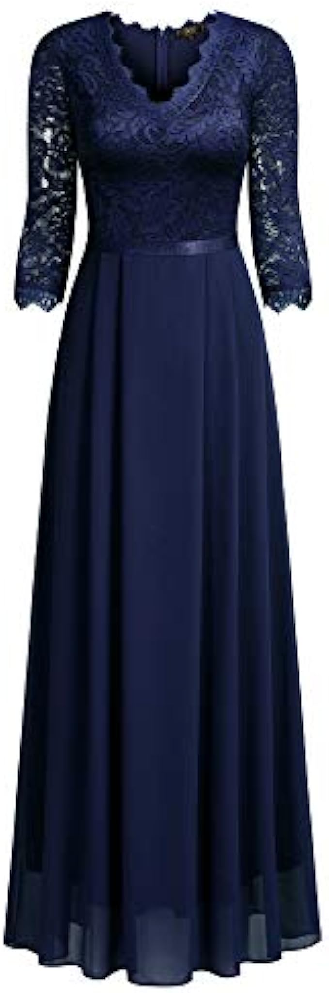 90% Polyester, 10% Spandex Imported Zipper closure Size RECOMMEND:US 4/6(Small), US 8/10(Medium), US 12/14(Large), US 16/18(X-Large),US 20 (XX-Large) Deep V Neck, Half Sleeve, Back Zipper, Floor Length Vintage Floral Lace Chiffon Design, Formal Long Maxi Style, Suit for Evening,Cocktail,Bridesmaid and other Formal Occasion Please Note that The Top Lace is Stretchy and Please Refer to the Size Chart in Left Product Description Picture Care Instructions: Please Put The Dress Into A Laundry Bag For Wash It With Low Temperature and Iron Carefully in Low Temperature Too