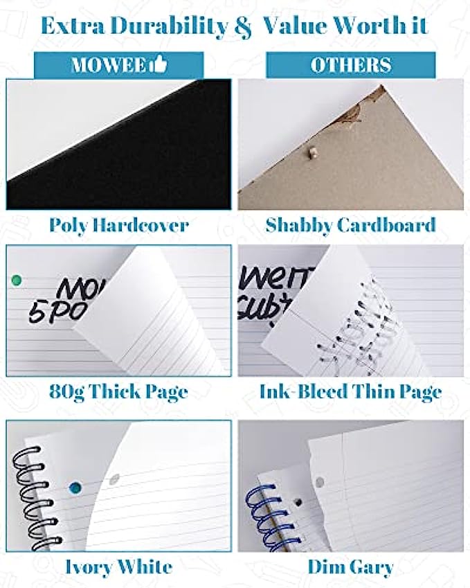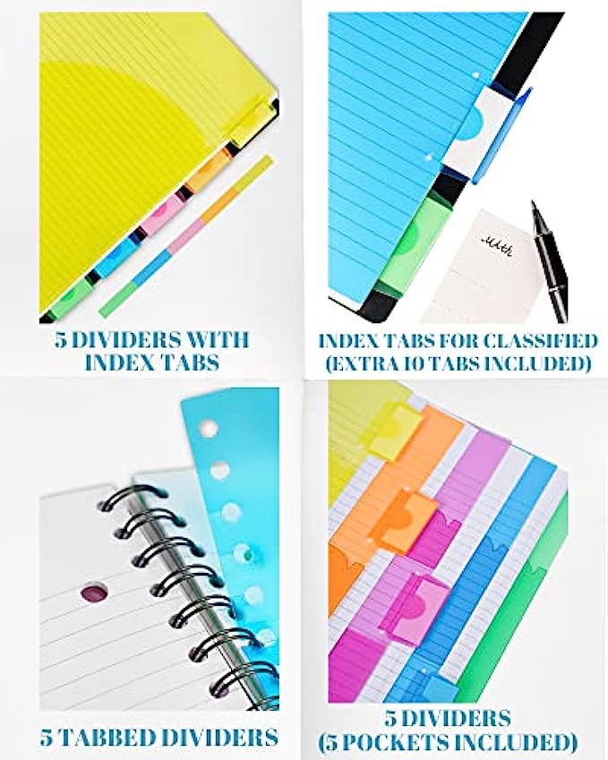 MULTIFUNCTIONAL NOTEBOOK: MOWEE 5 Subject notebook with 5 movable color code storage dividers. Easy for organizing your school assignments, your office worksheets, and business notes. 10 pieces of extra tabs are provide for replacement.