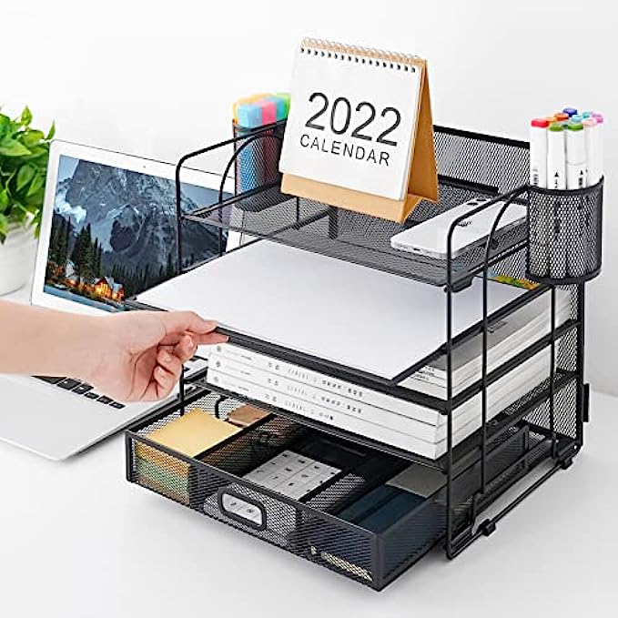 Marbrasse 5-Trays Desktop File Organizer with Pen Holder | Paper Letter Tray with Drawer and 2 Pen Holder | Mesh Office Supplies Desk Organizer for Home Office (Black)