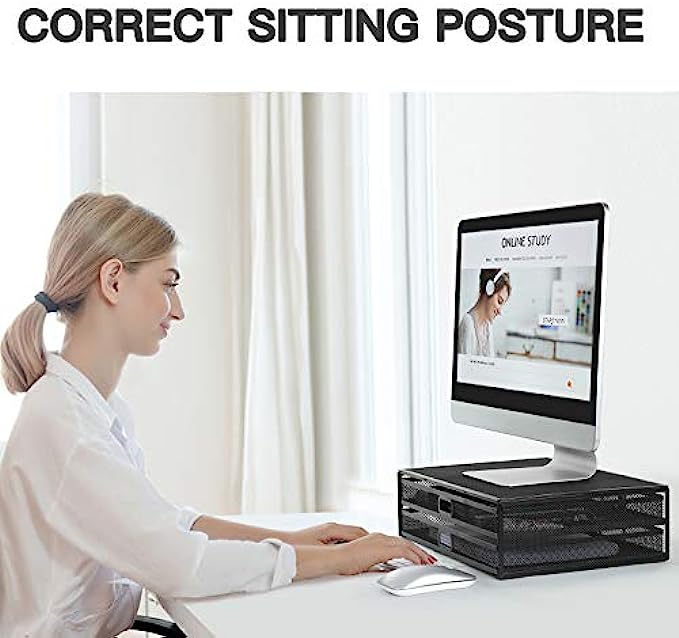Monitor Stand, Monitor Stand with Drawer, Monitor Riser Mesh Metal, Desk Organizer, Monitor Stand with Storage, Desktop Computer Stand for PC, Laptop, Printer - HUANUO
