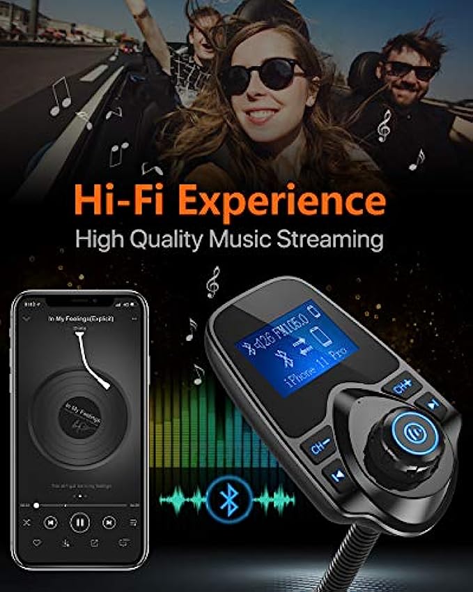 1.44 Inch LCD Display: Nulaxy KM18 Bluetooth FM transmitter has a 1.44 inch screen for better displaying information like phone calls, FM channels, music, car battery voltage, etc. The ideal screen size to assist you in driving safe without disturbance. Flexible Gooseneck&Bluetooth V5.0: The rotatable Gooseneck of the wireless radio adapter can provide you with an adjustable viewing angle and optimal viewing comfort of LCD display screen. With the Bluetooth V5.0 technology, the car bluetooth adapter can provide a more stable and faster connecting without intermittent disconnection. Noise Cancellation&Hi-Fi Sound Quality: Nulaxy noise-cancellation technology dampens the road noise and gives you clear, crisp sound for hands free calls. High Quality Music Streaming ensures crystal clear sound for listening music and hands-free calls. Hands-free Calls: All in one button for hands-free calls: answer/reject/hand up/recall make you seamlessly switch between incoming calls and music. Enjoy complete voice-control and safer driving with this Bluetooth transmitter. Wide Compatibility: The fm transmitter bluetooth for car is compatible with most devices on the market, such as iPad, iPhone, iPod, HTC, Galaxy, Sony, MP3 player, tablet and Android Smartphones. You can play your favorite songs on your car stereo via Bluetooth, TF Card and Aux Cable. And it fits 12V-24V cars and trucks.