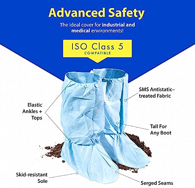 SMS antistatic–treated fabric with low linting. QPA protective shoe and boot covers, manufactured in ISO Class 5 controlled clean facilities for manufacturing, biotech, pharmaceutical and lab settings
