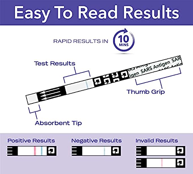 Home COVID-19 test is quick, simple and designed for self-collected nasal swabs, ages 14 or older; Ages 2+ can be tested if adult collects sample; straightforward results with pink or blue line on test strip